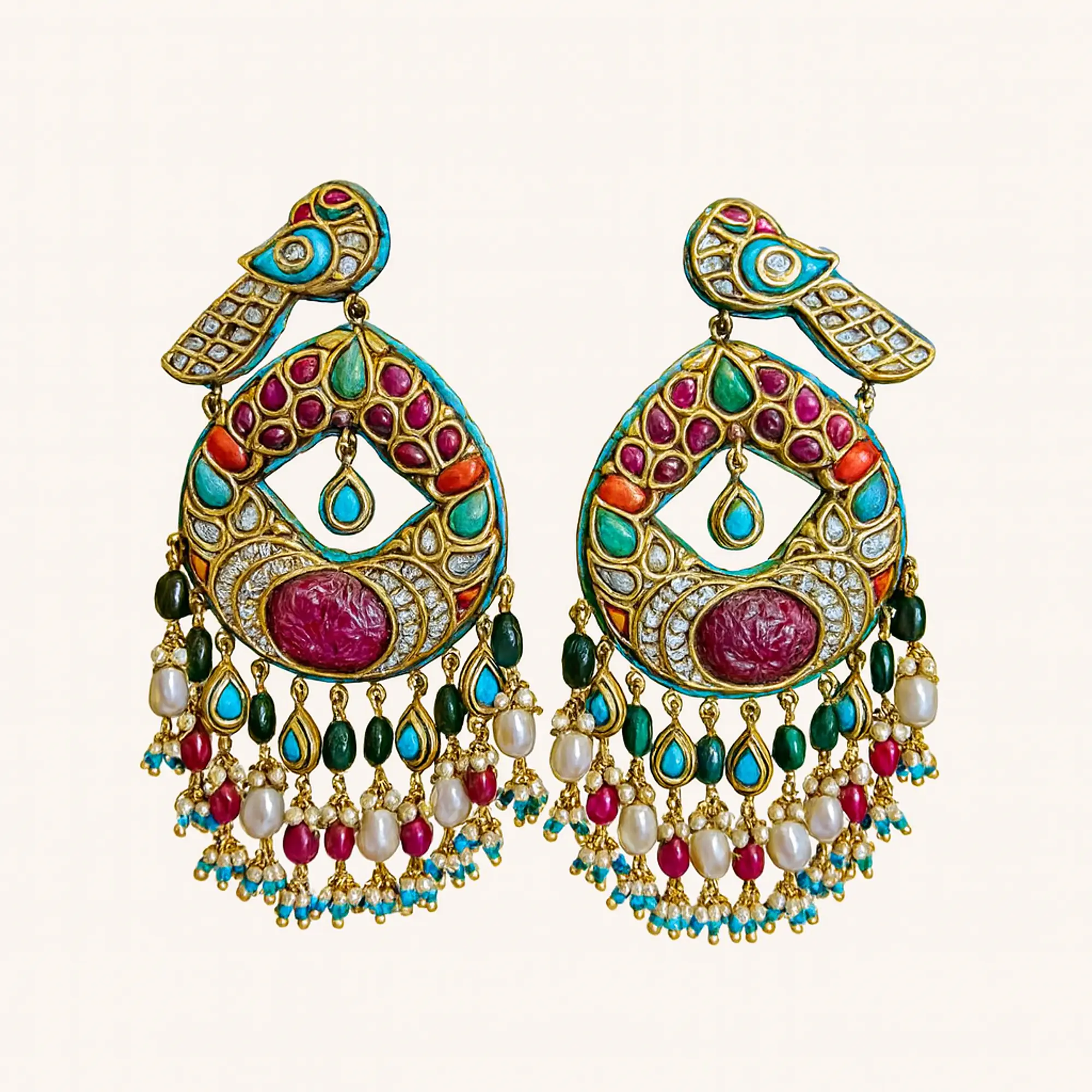 Celebrate the splendor of heritage jewelry with this exquisite 22kt gold Peacock Chandbali, a true testament to traditional artistry. Adorned with real precious stones in vibrant, rich hues, the design beautifully mirrors the majestic elegance of the peacock.
