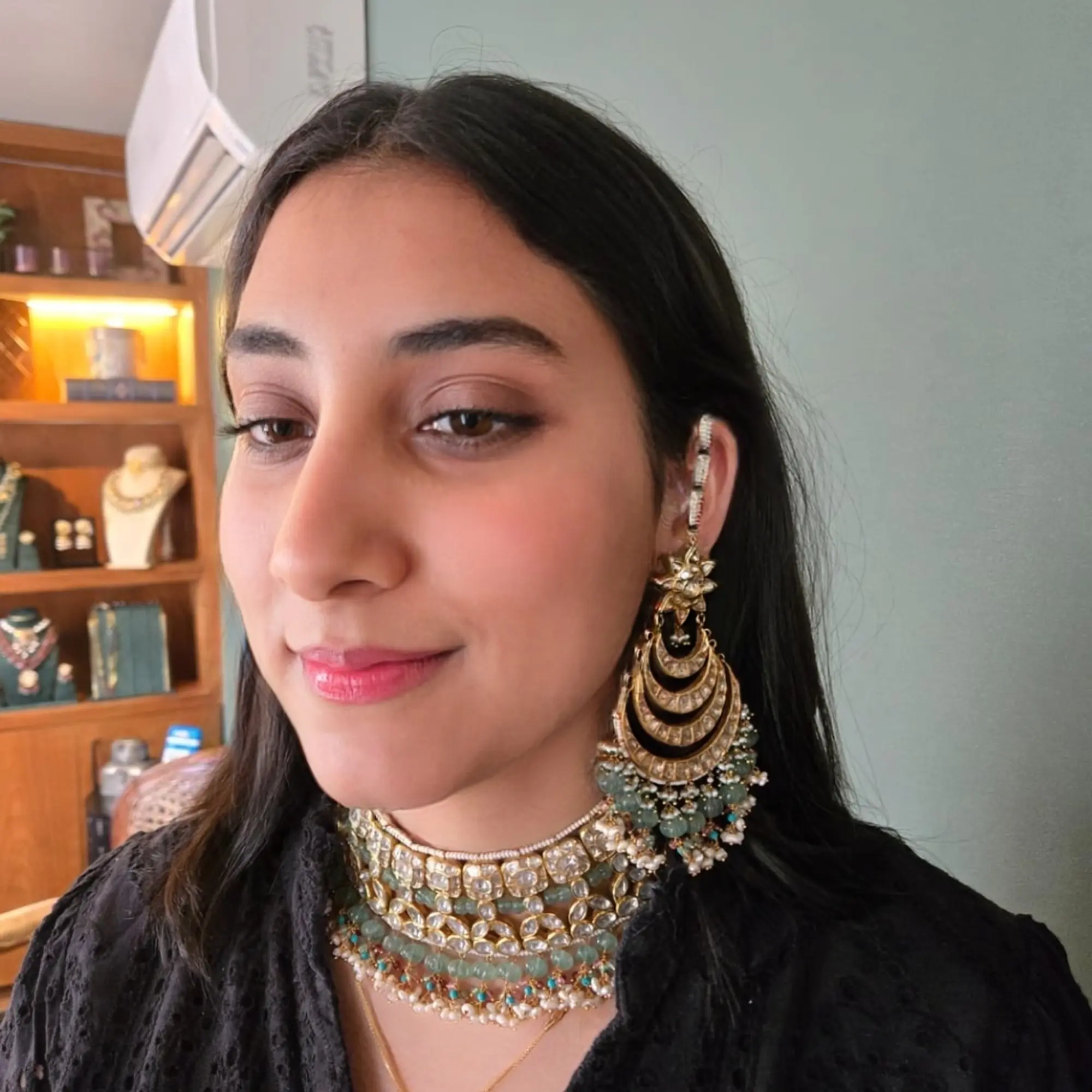 Delicate detailing, a graceful crescent silhouette, and intricately set polki pieces come together to form a piece that exudes understated sophistication. Perfect for bridal looks, festive celebrations, and grand occasions, this elegant chandbali elevates any ensemble with its refined sparkle and classic appeal.